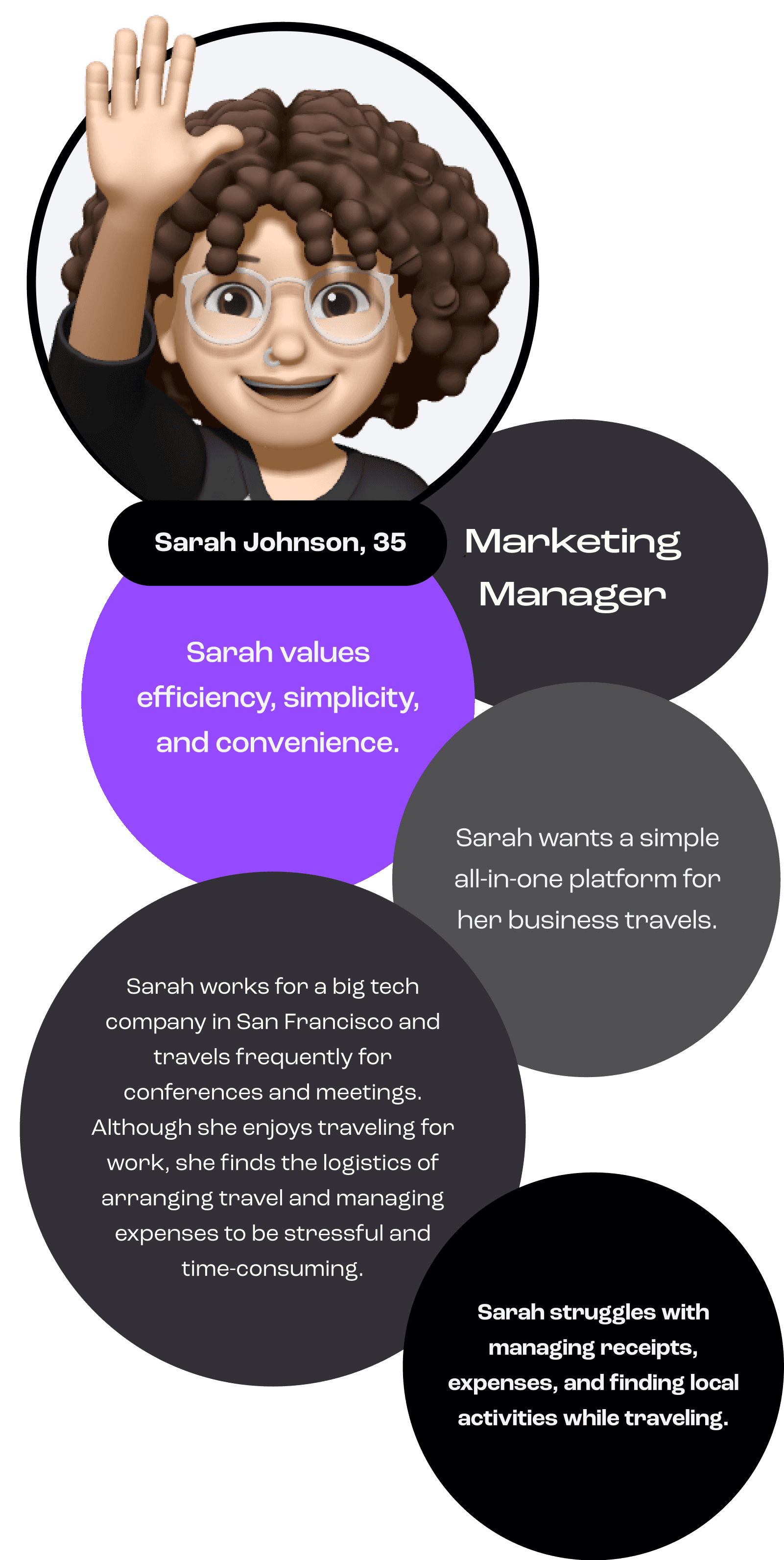 The inspiration came from seeing my colleagues struggle with an outdated and confusing travel service they had to use for work trips. Moments of their quality personal time were lost while sitting in hotel rooms, clueless about the destination’s activities. Our goal is to create an easy-to-use interface for business travelers who want to keep track of all their trip information while encouraging them to get out of their hotel rooms.